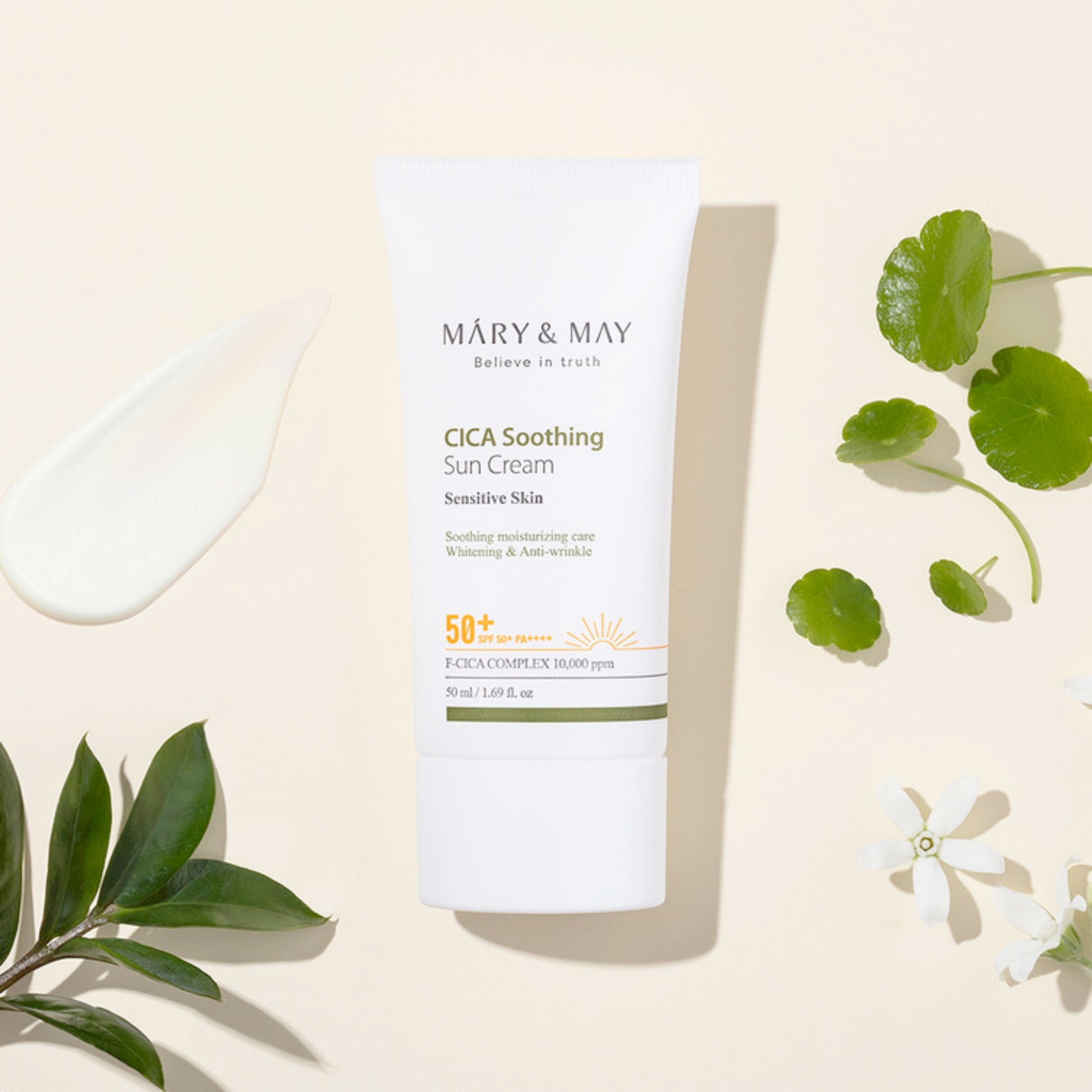 Mary&May Cica Soothing Suncream, Triple functional sunscreen for UV protection/whitening/wrinkling improvement, which adds 10,000ppm of Cica complex to provide a strong UV protection and calming effect on skin damaged by external irritation.