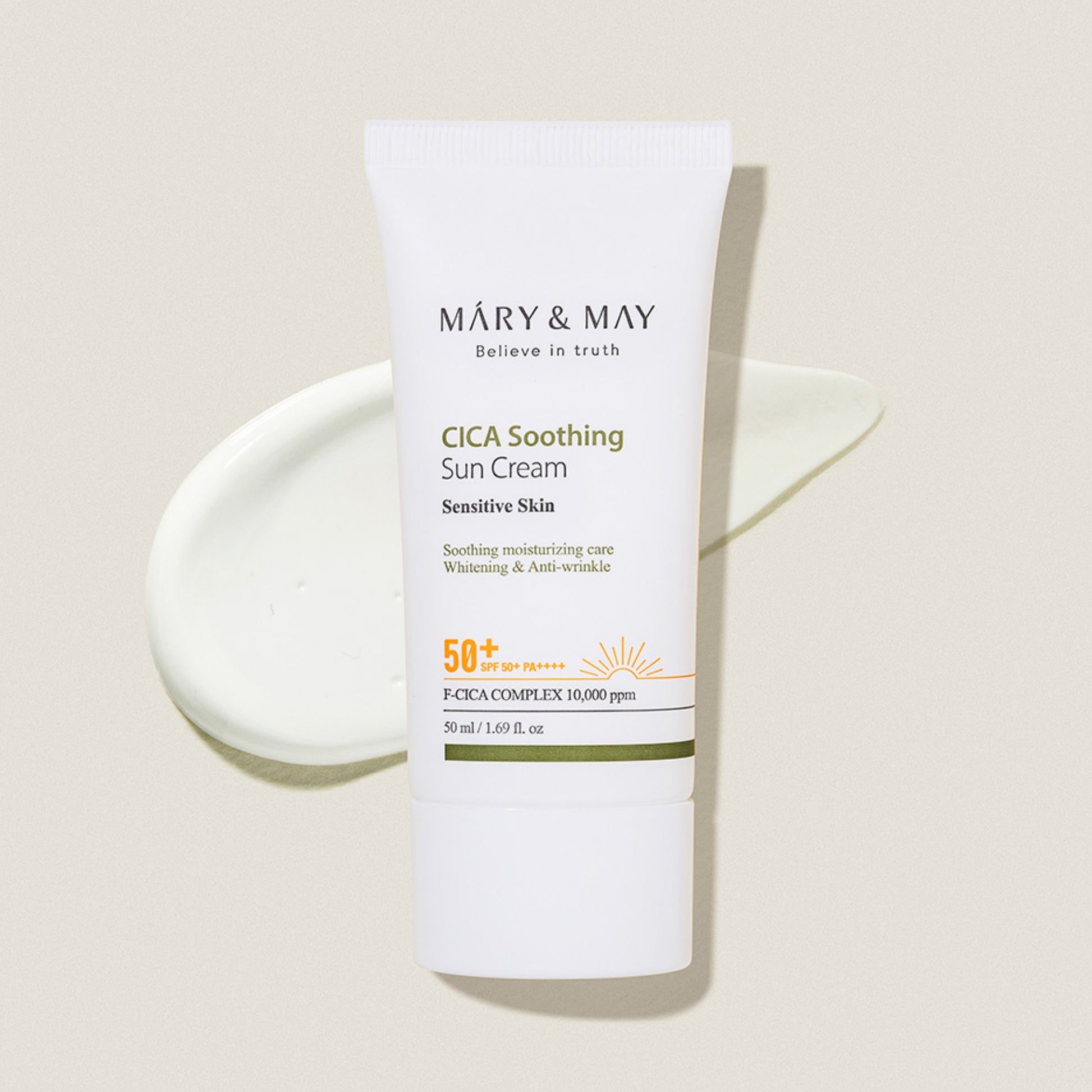 Mary&May Cica Soothing Suncream, Triple functional sunscreen for UV protection/whitening/wrinkling improvement, which adds 10,000ppm of Cica complex to provide a strong UV protection and calming effect on skin damaged by external irritation.