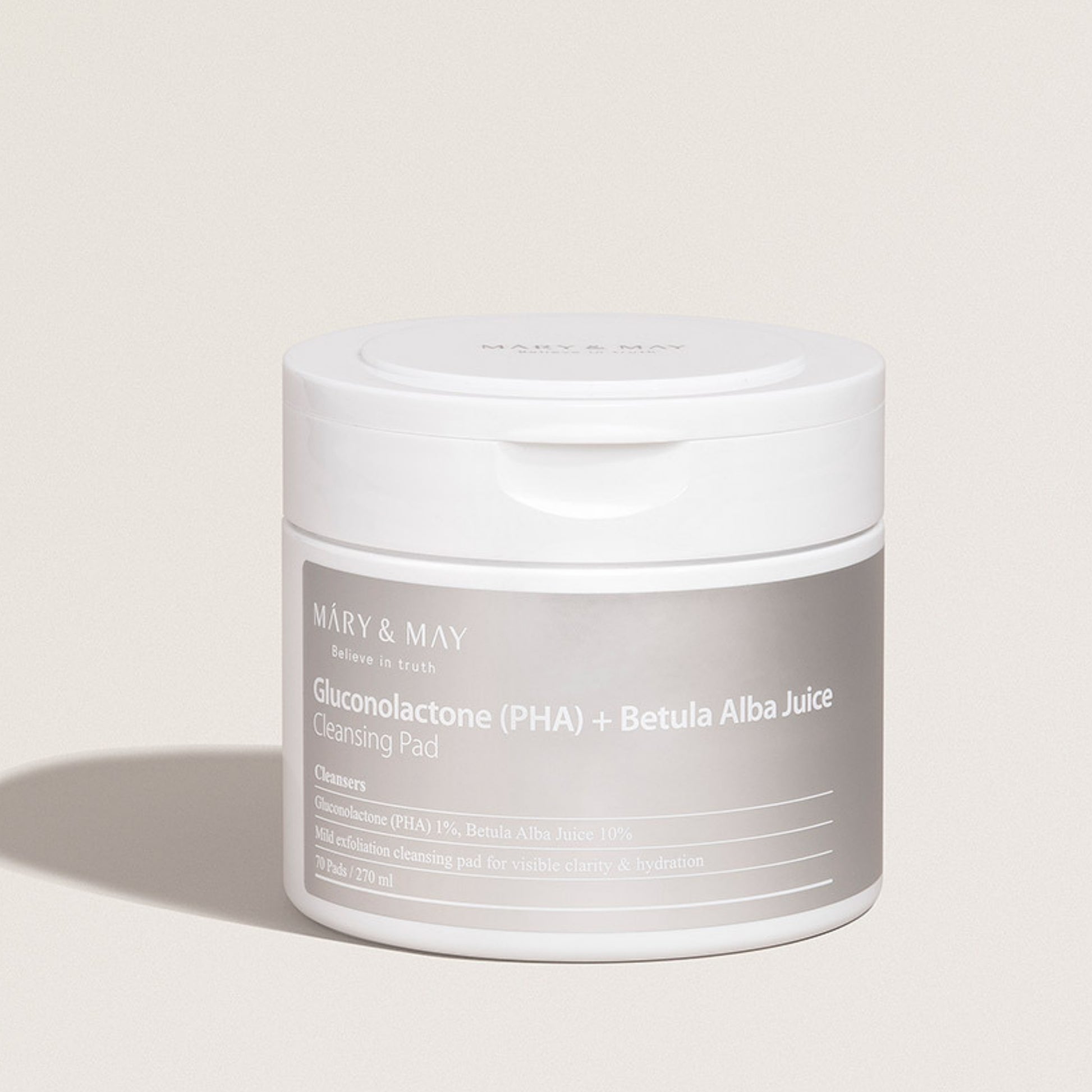 Mary&May Gluconolactone (PHA) + Betula Alba Juice Cleansing Pad, Mild exfoliation cleansing pad for visible clarity & hydration, 70 Pads/ 8cm diameter.
