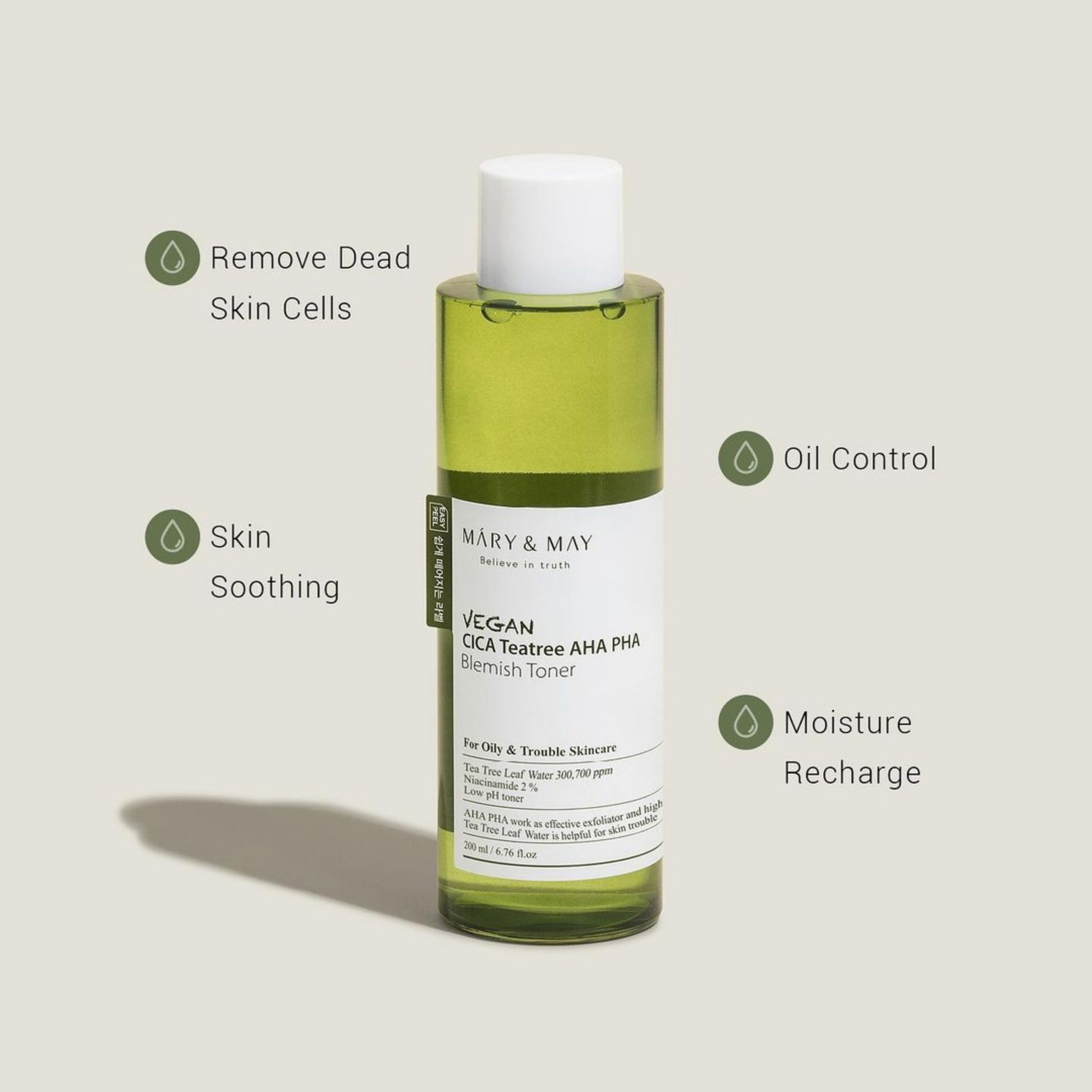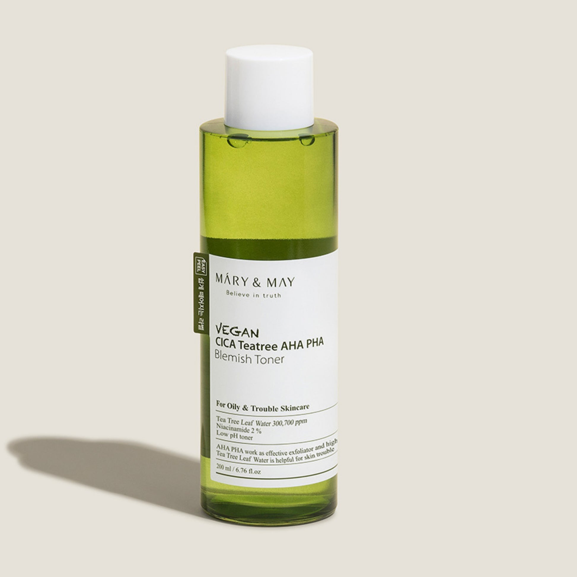Mary&May Vegan Cica Tea Tree AHA PHA Blemish Toner, AHA PHA ingredients remove excessive sebum, wastes from pores and dead skin cells, and tea tree leaf water and patented ingredients make clear and clean skin.